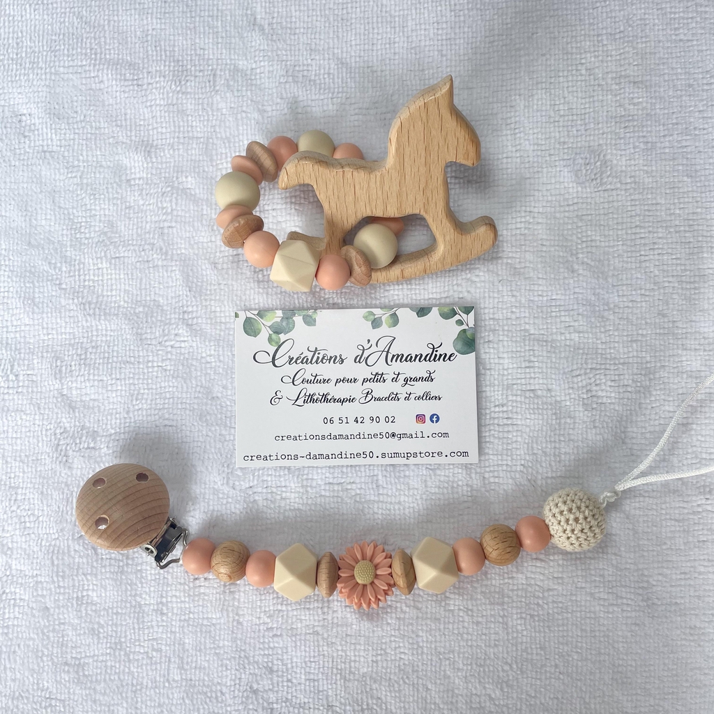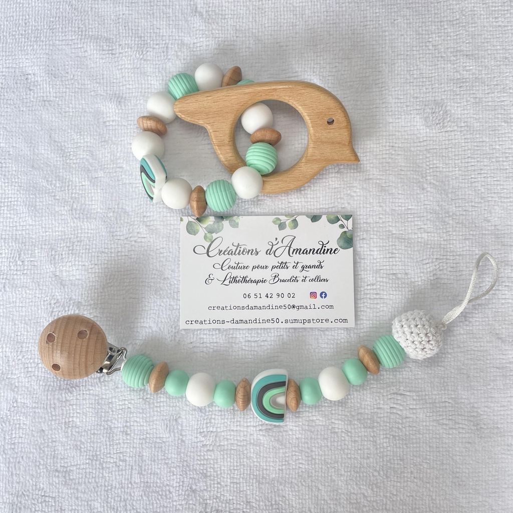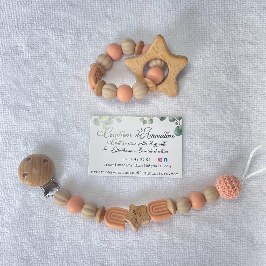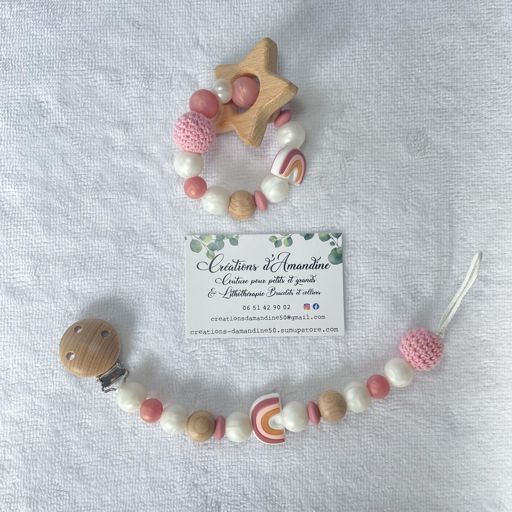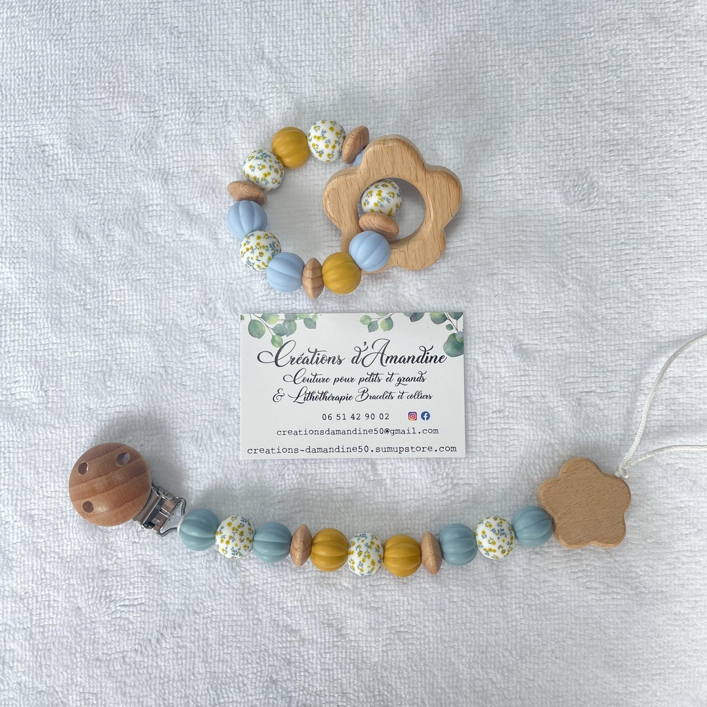 Attache tétine et anneau de dentition assortis.